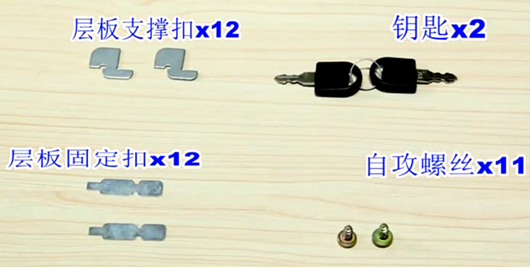 第五步,也就是后一步,就是拆装文件柜内部的隔板的组装。要先把装置隔板的小件找出,并确认数量及完好性,然后按照使用情况设定隔板的高度,用卡扣进行固定安装,这时候就完成了整个拆装钢制文件柜的组装工作。下面洛阳中星附上装配过程中使用到的小配件图例: